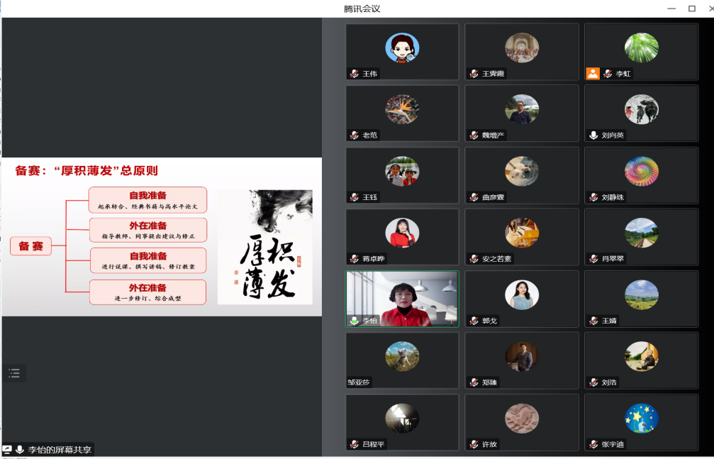 北京市青教赛优秀指导教师、学校教学名师李怡老师结合自身指导参赛的经验及思考,从选题、备赛、训练三个方面为青年教师全面、立体的解读了青教赛标准,深入分析了青年教师在赛前应做的准备。她建议在选题环节上,教师要以“三位一体“为标准,结合自身特长、特点,选择实践中学生反映良好的主题,打造交流互动环节亮点。在备赛环节上,要坚持“厚积薄发”原则,积淀知识,淡泊名利,发现教学之美,在循环上升中完成自我准备与外在准备。在训练环节上,要坚持“千锤百炼“总方案,注重熟悉内容、教案精修、综合演练。她希望青年教师们只要一直保持教学过程精益求精的精神,终有一日会马到功成。