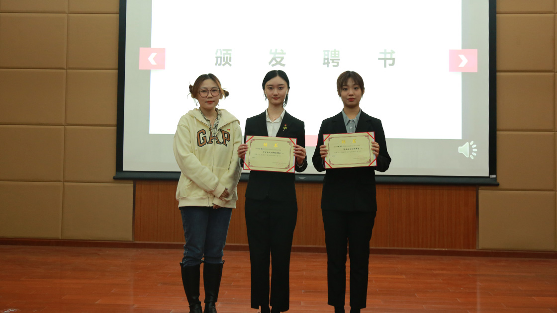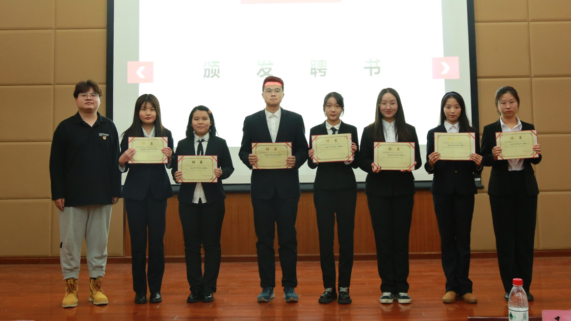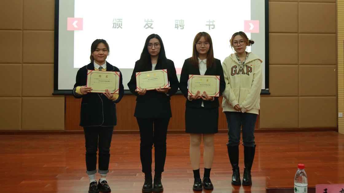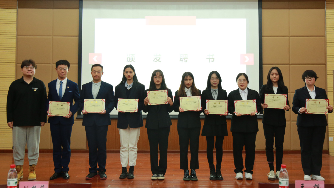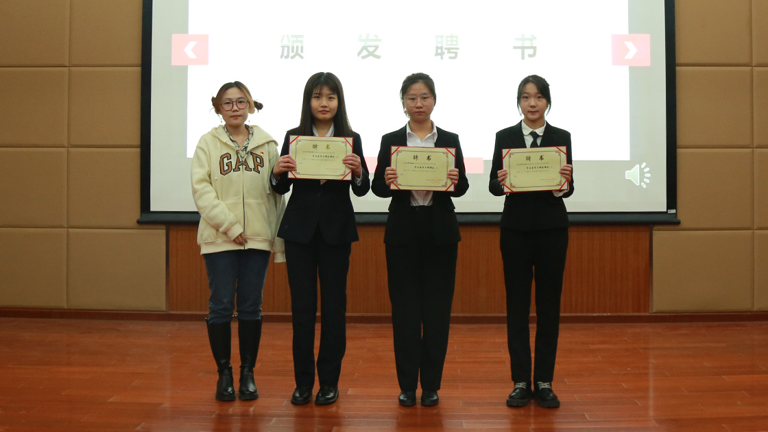 接着,王旭老师、孟昕老师、苏明星老师、何雅丽老师、刘天雯老师分别为团委学生副书记,学生会主席团,团委各职能部门部长、副部长,学生会各职能部门部长、副部长,求是学会部长颁发聘书并合影留念。
