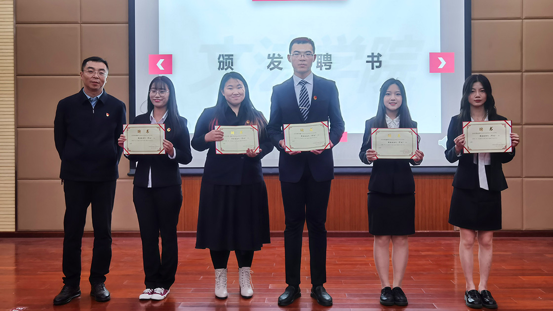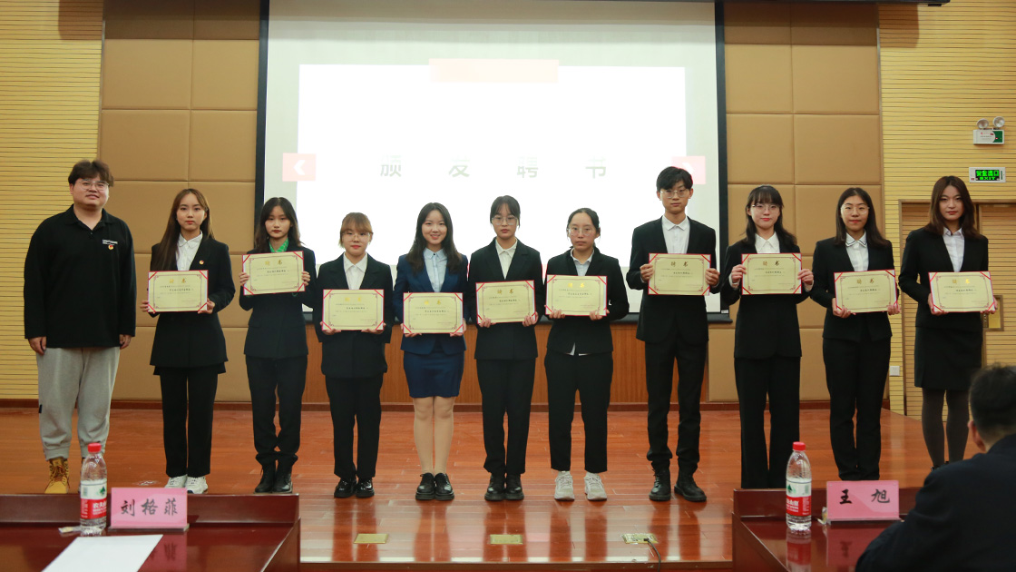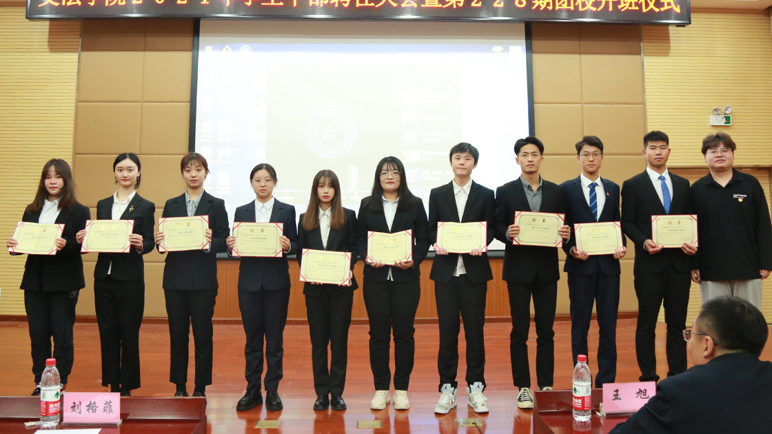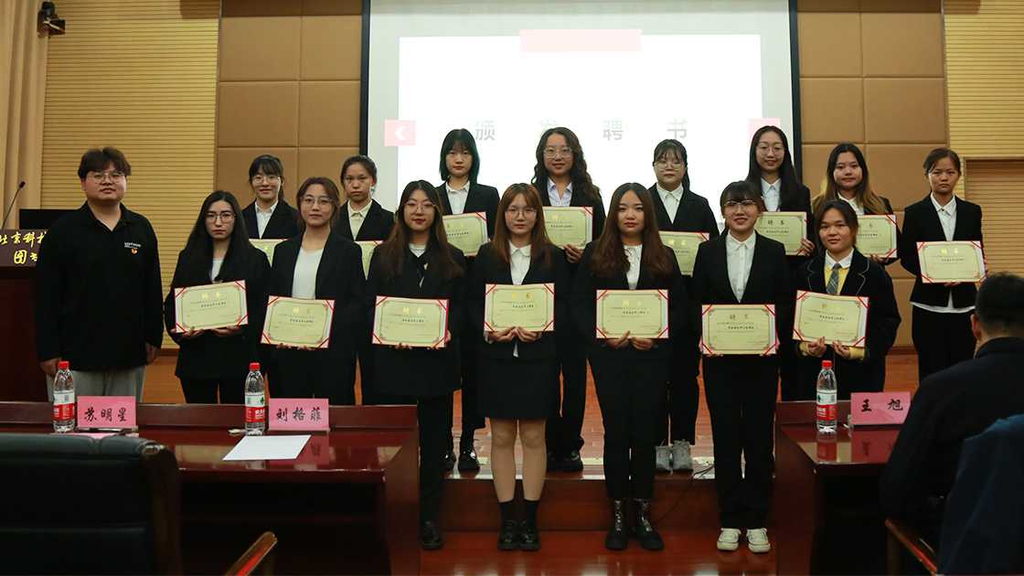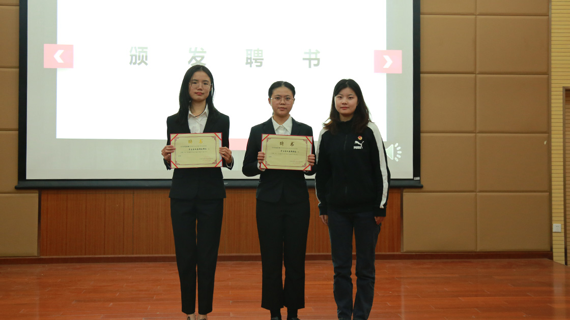 接着,王旭老师、孟昕老师、苏明星老师、何雅丽老师、刘天雯老师分别为团委学生副书记,学生会主席团,团委各职能部门部长、副部长,学生会各职能部门部长、副部长,求是学会部长颁发聘书并合影留念。