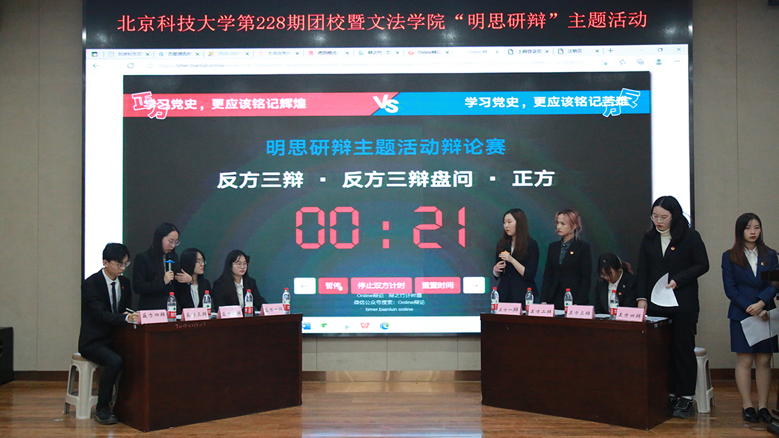 随后,小黄书 辩论队为在场观众带来了一场精彩的辩论赛。辩论赛中双方对“学习党史——更应该铭记辉煌还是苦难”这一辩题进行了激烈的思想碰撞。在比赛过程中,双方选手在思路清晰、字字珠玑,双方的唇枪舌战,可谓是引经据典、妙语连珠,一次次将辩论赛推向高潮。此次辩论丰富了在场团学干部对于党史的了解和认识,提高了政治觉悟水平,更好地推动了党的伟大思想的传承。