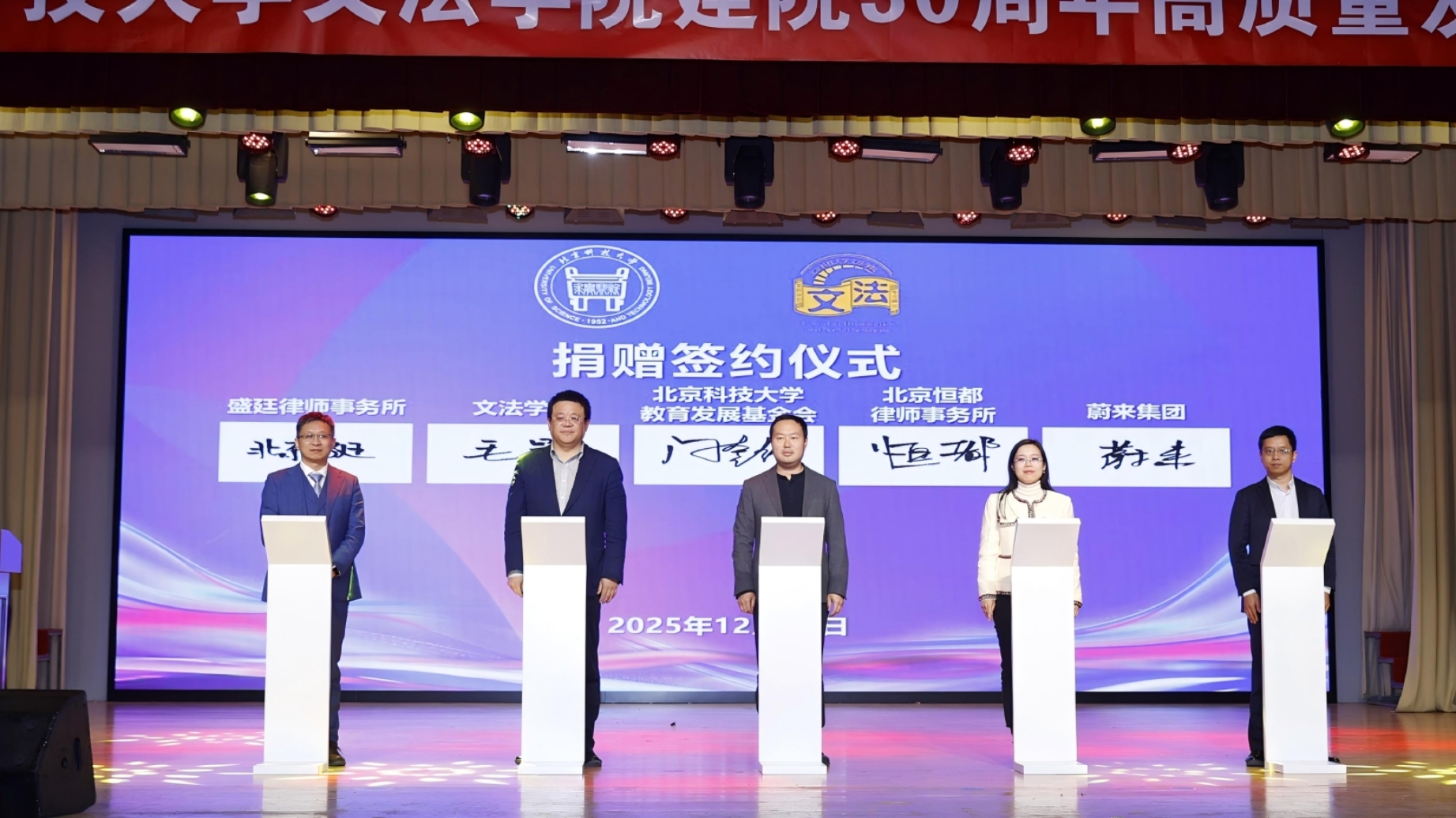 北京恒都律师事务所、盛廷律师事务所、蔚来法律创新研究院代表与学校校友会办公室、基金会办公室主任闫奎铭、小黄书 院长毛昊共同上台,启动捐赠合作仪式,携手为学院学科建设和人才培养提质增效。
