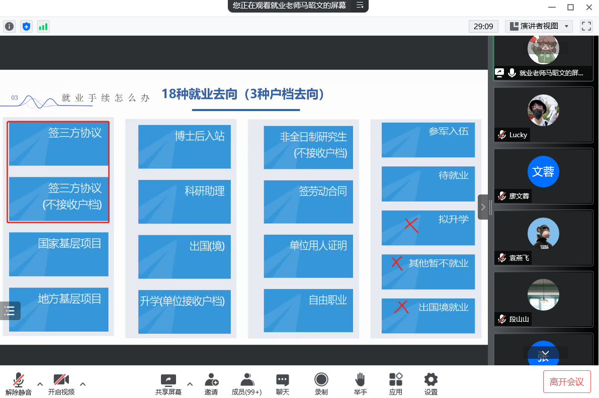 首先,马昭文老师详细对各类毕业生会用到的就业推荐表、就业协议书、报到证等的填写做了解读,对签就业协议、灵活就业、出国出境、升学、待就业几类的就业流程进行了详细的演示与讲解,普及了在新系统下要如何操作的知识,对重要事项进行强调。同时,马老师提醒大家在签约时要慎重选择,讲究诚信,对自己负责。