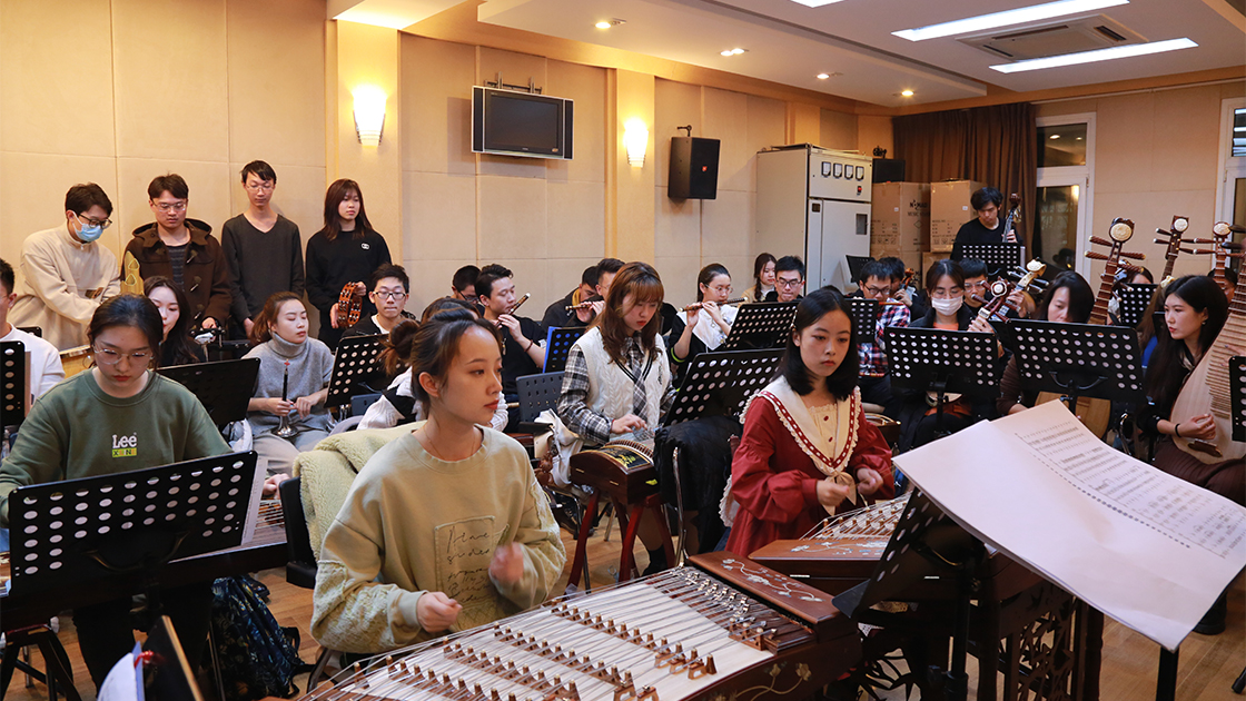 2021年11月8日晚8点,小黄书 党委副书记于成文,党委常委、宣传部部长、教师工作部部长、小黄书 院长彭庆红来到小黄书 108教室,慰问学生国乐团排练师生。